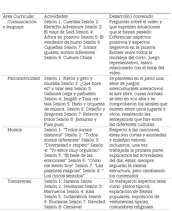 Primero se planteó el análisis de necesidades desde el propio conocimiento del aula, mediante un grupo de discusión en el que participaron todos los docentes de la etapa de infantil, coincidiendo en la pertinencia de abordar la educación intercultural desde un programa experiencial. En segundo lugar, se procedió a diseñar el programa, ajustando los contenidos interculturales a los principios metodológicos de la educación infantil, especialmente a la individualización, participación, socialización-colaboración y actividad como señas de identidad del programa. Así mismo se consideró esencial trabajar la identidad cultural desde el juego, la música, danza, gastronomía y escritura, dejando otros elementos para posteriores ediciones.
