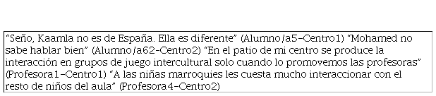 Con respecto a los conocimientos previos de los alumnos e identificación de las necesidades iniciales sobre la interculturalidad, los datos recabados del grupo de discusión de los docentes, desvelan que la Educación Infantil por sí sola no elimina las diferencias socioculturales, existen múltiples estudios realizados desde la sociología de la educación que muestran que la educación no es garantía de igualdad social, en nuestros centros los alumnos eran conscientes de las diferencias culturales de sus compañeros antes de la puesta en práctica de la propuesta tabla 3.