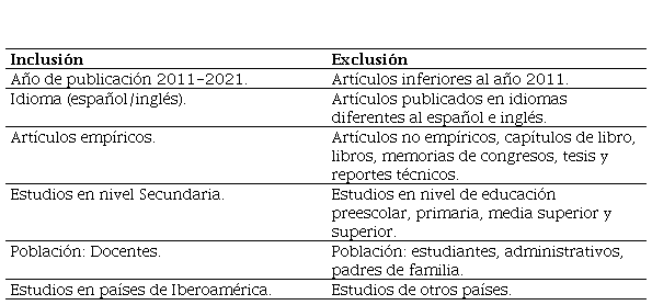 Durante el proceso se trabajaron con criterios de inclusión y exclusión tomando en cuenta las palabras claves y el objetivo estipulado sobre la población y el nivel educativo de interés. Es importante destacar que fueron considerados los estudios que incluían a otros niveles educativos siempre y cuando el nivel de secundaría formara parte de la población. A continuación, se presentan los criterios inclusión y exclusión (ver tabla 1).