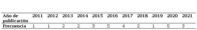 A continuación, en la siguiente tabla se describe el comportamiento de las investigaciones del 2011 al 2021, los artículos están enfocados en medir el nivel de competencias digitales del profesorado de secundaria, donde se puede observar que el mayor número de publicaciones en los años 2016 y 2020 (ver tabla 2). Cabe destacar que en las publicaciones más recientes se hace mención sobre la importancia de las competencias digitales por la COVID-19.