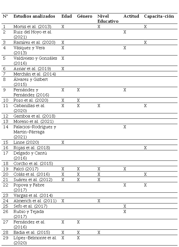 De acuerdo con la Tabla 3, existen diversos factores que impiden a los docentes hacer uso de las TIC. Cabe destacar, que la edad es un factor que periódicamente ha sido evaluado en el 55% de los estudios analizados (1, 3, 4, 5, 6, 9, 10, 11, 15, 19, 20, 21, 24, 27, 28, 29), donde se encontró que ésta, a medida que avanza incrementa la dificulta por utilizar las TIC, debido a las escasas nociones que tienen optando por utilizar métodos tradicionalistas, por lo que se les considera como “inmigrantes digitales” al tener que salir de su zona de confort para adentrarse al mundo digital (Shiang et al., 2014; Fernández y Fernández, 2016; Cabanillas et al., 2020; Linne, 2020). A diferencia de los jóvenes, son más hábiles y actualizados con la tecnología catalogándolos como “nativos digitales” por su acercamiento con las TIC (Vásquez y Vera, 2013; Shiang et al., 2014; Valdivieso y Gonzáles, 2016; Pozo et al., 2020). Aunque autores coinciden que la edad no es obstáculo en el nivel de las competencias digitales (Falcó, 2017; Aznar et al., 2019) sino que solo les falta conocer las herramientas a profundidad para implementarlas en aula de clases (Shiang et al., 2014).