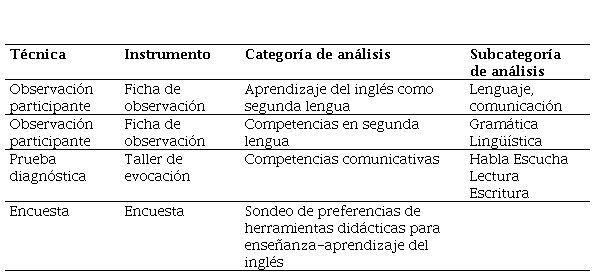 En el análisis de información se identificaron necesidades de los estudiantes en relación con la apropiación del inglés mediante estrategias didácticas convencionales, como dificultades con la construcción gramatical de la segunda lengua y su pronunciación, y la renuencia a comunicarse en este idioma por sentirse inseguros y sin la suficiente instrucción.