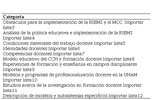 Los textos identificados con esta categoría son, en su mayoría, reflexiones críticas y análisis desde la experiencia, elaborados por docentes adscritos a alguno de los planteles del Colegio de Ciencias y Humanidades, que versan sobre las políticas y los programas de formación docente en el Colegio dentro del marco de la RIEMS, así como sobre propuestas de formación específicas en alguno de los campos disciplinares; en esta última línea temática podemos ubicar también algunos textos enfocados al profesorado de la Escuela Nacional Preparatoria (Ramos, 2019).