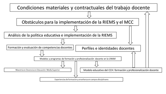En las investigaciones revisadas, resaltan las condiciones materiales y contractuales de trabajo de los docentes, especialmente en planteles ubicados en contextos de alta marginalidad, que representan un obstáculo para la implementación de la reforma y para sus componentes como el MCC, y cuyas repercusiones son más graves para la educación a ese nivel, pues se traducen en un obstáculo para la profesionalización de los docentes. Además, los estudios coinciden en señalar que los esquemas de evaluación y formación docente derivados de la RIEMS no son pertinentes, dado que no reconocen las necesidades derivadas de los contextos locales; es decir, pretenden dar uniformidad a un nivel donde prevalece la diversidad, por lo que se perpetúan las desigualdades e inequidades de género y la estabilidad laboral.
