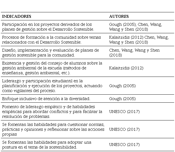 El hecho que para la configuración de una escuela que promueve la EDS, los docentes ubiquen en un lugar preponderante indicadores relacionados con la dimensión socio-económica resulta significativo. Esta mirada de la escuela en el contexto de la EDS que destaca esta dimensión resulta relevante en gran medida teniendo en cuenta que, la formación sobre y para el desarrollo sostenible invita a una reflexión articulada y transdisciplinar de la realidad desde lo intersectorial. La EDS implica la mirada crítica de los acontecimientos, acciones y decisiones que desde lo social, político, cultural y económico se están llevando a cabo, lo cual afecta de manera directa o indirecta el ambiente y el bienestar de las comunidades. Desde el desarrollo sostenible se propende porque las personas sean capaces de crear alternativas que contribuyan a la erradicación de la pobreza y otros problemas sociales con el propósito de construir sociedades más justas y equitativas (Mckeown et al., 2002; Leal, 2008). Esta visión holística e interdisciplinaria de la realidad, de sus problemas, se constituye en una plataforma sobre la que se sustentarán las decisiones curriculares y pedagógicas de la EDS. Por esto se entiende la propuesta de los participantes, la cual privilegia la propuesta de indicadores vinculados a la dimensión socioeconómica. Estos indicadores propuestos se asocian con los referentes internacionales de Kalaitzidis (2012), UNESCO (2017), Chen et al. (2018) y Gough (2005). Este último autor, incluye, además, entre los indicadores de esta dimensión, las acciones que los estudiantes y la comunidad educativa desarrollan en torno al uso eficiente de los recursos económicos asociados a problemas sociales y ambientales (Gough, 2005). Esta mirada global también la comparte Kalaitzidis (2012), cuando destaca la importancia de la interacción escuela - comunidad en la realización de acciones sociales bajo principios de participación democrática que procuren la transformación y el bienestar comunitario.