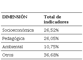 Como se puede apreciar, la dimensión socioeconómica es la que agrupa la mayor parte (26,52%) de los indicadores propuestos por los docentes encuestados y se evidencian en la tabla 4.