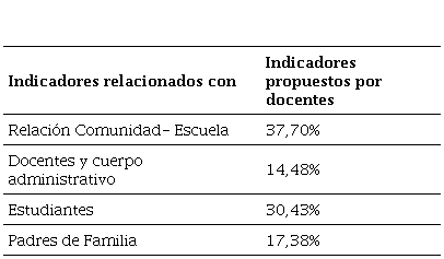 Esta dimensión se relaciona con la dinámica social y económica, incluyendo las relaciones escolares entre cuerpo docente, estudiantes, padres de familia y comunidad, la administración de recursos, los planes de gestión, alianzas con la comunidad y proyectos en pro de la mejora social y económica. De manera puntual, las respuestas dadas por los docentes señalan en mayor medida indicadores relacionados con la categoría de relación comunidad-escuela (37,70%) como los que se reportan a continuación: