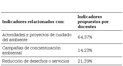 Por último, los docentes referencian indicadores que corresponden a la dimensión ambiental (tabla 6):