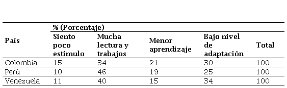 Para la gran mayoría de los estudiantes encuestados de las tres universidades, el cambio de la modalidad presencial a la virtual logró que los estudiantes en el proceso de enseñanza-aprendizaje hayan tenido que llevar a cabo mucha lectura y la realización de trabajos y asignaciones para poder cumplir con los objetivos planteados (34% para la Universidad de Manizales, 46% para la Universidad Ricardo Palma y 40% para la Universidad Privada Dr. Rafael Belloso Chacín).