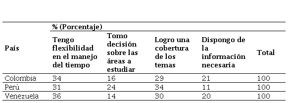 Con relación al proceso educativo y la modalidad virtual, gran parte de los actores del proceso de enseñanza-aprendizaje encuestados consideraron que han tenido una mayor flexibilidad en el manejo del tiempo (34% para la Universidad de Manizales, 31% para la Universidad Ricardo Palma y 36% para la Universidad Privada Dr. Rafael Belloso Chacín).