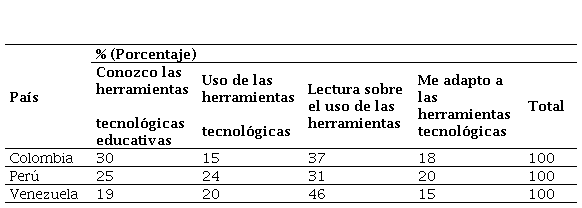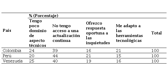 Por otra parte, para otro grupo de encuestados esta falta de actualización en el uso de las herramientas tecnológicas se ha visto reflejada en el poco dominio de aspectos técnicos de las herramientas tecnológicas (24% para la Universidad de Manizales, 20% para la Universidad Ricardo Palma y 25% para la Universidad Privada Dr. Rafael Belloso Chacín).
