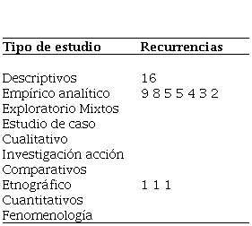 De igual forma, el análisis de los resultados en esta sección debe categorizar las tendencias en la prevalencia de los estudios descriptivos. Hay un total de 22 documentos de este tipo, que tienen como objetivo reflejar las características, hechos y perspectivas de la enseñanza-aprendizaje del inglés, bilingüismo, TIC, ruralidad, donde a través de sus propias narrativas y experiencias se logra evidenciar la necesidad de gestar y construir escenarios de oportunidades, mejorar prácticas docentes, capacitación, implementar nuevas metodologías, mediación TIC, y nuevas formas de construir políticas lingüísticas con una visión socio crítica.
