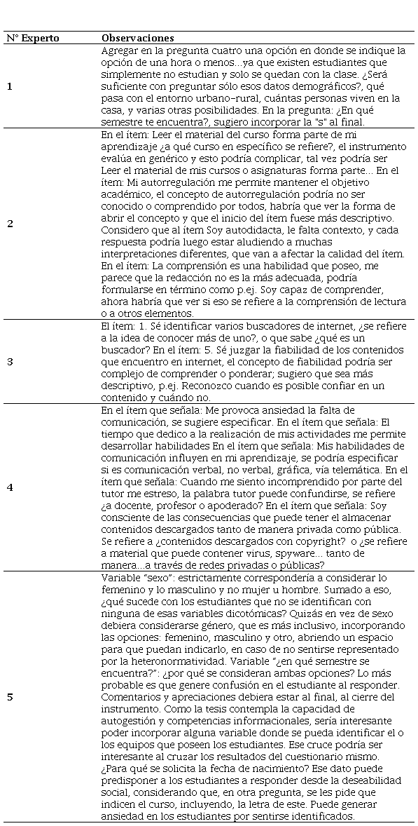 Dentro de las principales observaciones presentadas, destacan elementos de redacción, precisión de conceptos, los cuales refieren a diferencias idiomáticas. Otro elemento que surge en las observaciones da cuenta de la variable sexo versus género, apuntando a la incorporación de género en su reemplazo, pues así permite la integración de estudiantes que no se sientan identificados con las palabras “femenino” y “masculino”.