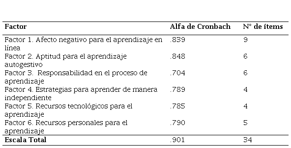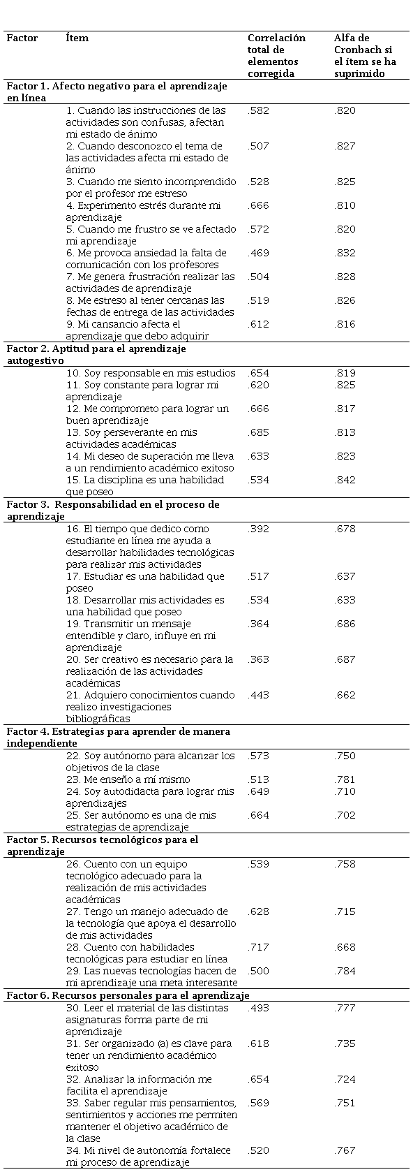 Respecto a los resultados de confiabilidad de los instrumentos, se presenta en primera instancia que la confiabilidad de la Escala de Aprendizaje Autogestivo arroja un Alfa de Cronbach de .901 correspondiente a la escala total (tabla 2). Se observa también que los cinco factores presentan un Alfa adecuado variando de .704 el factor 3. Responsabilidad en el proceso de Aprendizaje y .839 para el factor 1. Afecto negativo para el aprendizaje en línea.