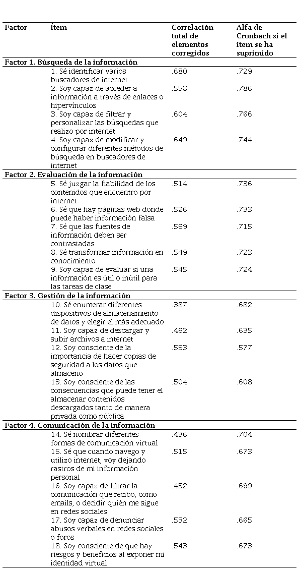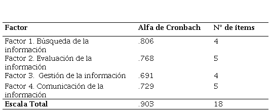 Respecto al Cuestionario de Competencias Informacionales, el análisis indica un Alfa de Cronbach que oscila entre .729 para el factor 4 y .806 para el factor 1, mientras que la escala total presenta un Alfa de .903 lo que es adecuado (tabla 4)