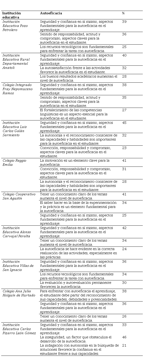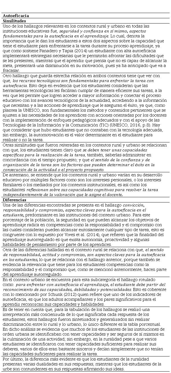 Los resultados constataron la influencia que tiene el autoconcepto acerca de las habilidades y destrezas que poseen los estudiantes al momento de enfrentarse a una actividad académica. Las creencias acerca de las capacidades que poseen los aprendices generan un impacto en la motivación, tanto de manera positiva o negativa. Se evidenció también, que la organización y planificación adecuada de las tareas y la persistencia en la realización de estas, ayudan a obtener mejores resultados y, asimismo, lograr mayores aprendizajes, sin importar el grado de dificultad del ejercicio. Por otro lado, a nivel tanto rural como urbano, es claro que el estudiante se debe sentir motivado por factores intrínsecos como lo es la automotivación, la autoactivación de sus conocimientos en concordancia con la variable de autoeficacia que sí genera una estabilidad emocional que ayuda al estudiante a mejorar en su participación y activación de conocimientos.
