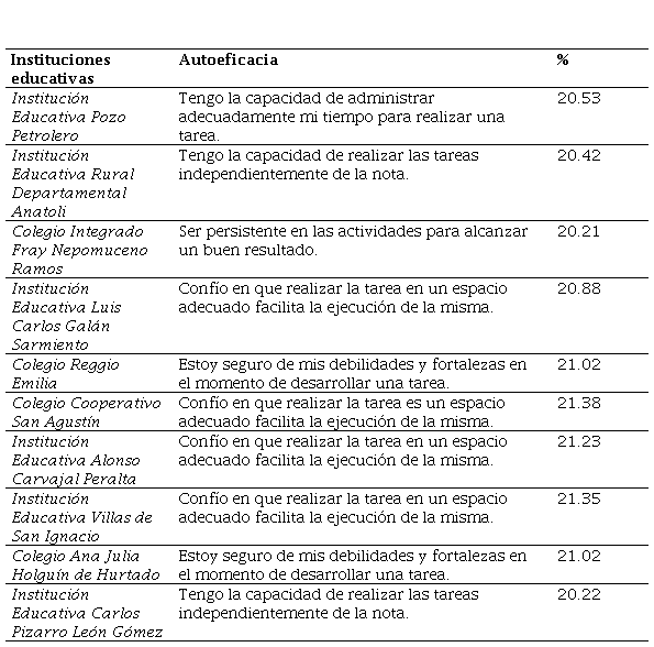Dentro de los resultados encontrados, se pudo inferir que los estudiantes de las instituciones reconocen sus habilidades a la hora de ejecutar una tarea, y así lograr mejores resultados. Como señaló Pajares (2008), los estudiantes se motivan cuando las expectativas de autoeficacia son grandes, ellos se esforzarán más y aplicarán las estrategias precisas para salir adelante frente a cualquier obstáculo que se le presente en el momento de llegar al éxito.