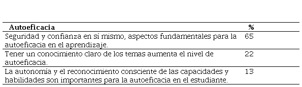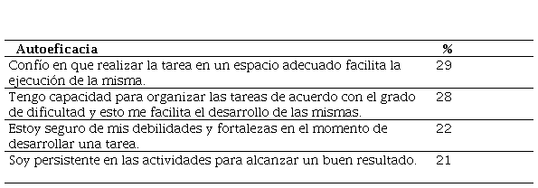 Es importante que el estudiante reconozca sus capacidades, así como la claridad frente a los temas que va a abordar durante la tarea, esto hace que se sienta más seguro al momento de enfrentarse a ella y estará más motivado al momento de desarrollarla. Cuando los aprendices confían en las capacidades que tienen para desarrollar una actividad académica, como plantean Font et al. (1994), la autoeficacia es un nivel de conciencia superior y, por ende, de regulación, lo que es necesario para conseguir un comportamiento estratégico y mayores posibilidades de éxito en la tarea.