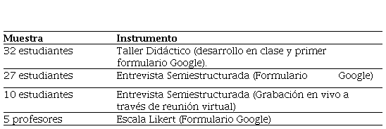 Como parte integral del diseño metodológico se diseñaron los instrumentos de recolección de información. Para este caso fueron, en primer lugar, taller didáctico, seguido de la entrevista semiestructurada, grupo focal y, finalmente, escala Likert.