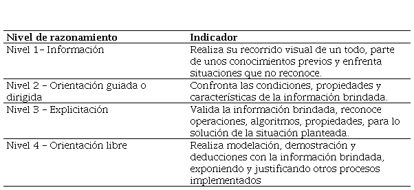Nivel 4: orientación libre, en este nivel el estudiante realiza modelación, demostración, deducciones, análisis, propuestas y representaciones no solo con la información brindada, sino que propone, expone y justifica con claridad otros procesos implementados para dar solución a la situación problema, reconociendo las características y condiciones de la situación (es consciente de las diferentes formas de proceder argumentando las razones); el docente plantea en este nivel actividades orientadas bajo la pregunta ¿de qué otras formas puedes dar solución a la actividad?