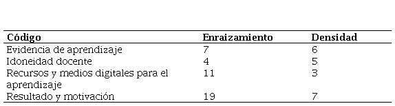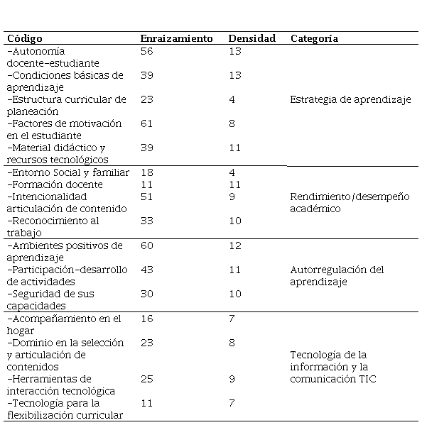 Mediante el modelo de codificación propuesto por Miles y Huberman (1994), quienes afirman la necesidad de definir un listado de códigos iniciales para hallar relación directa entre las categorías, desde los códigos iniciales se estableció cohesión entre la cantidad de veces que se asocia un código con otro (enraizamiento) y la cantidad de veces que se repite (densidad), los cuales pasaron por un ejercicio de triangulación de datos y teórica con las que se consolidó esquemas de concordancia y/o el nivel de vinculación de un código con los instrumentos uno y dos, hallando resultados contundentes. La tabla 2, muestra la relación de los enraizamientos y la densidad de los códigos con las categorías, ratificando la cuantía numérica de estas; para la categoría de estrategia de aprendizaje, los códigos con mayor elevación de densidad fueron autonomía docente-estudiante, condiciones básicas de aprendizaje y enraizamiento factores de motivación en el estudiante. Para la categoría rendimiento/desempeño académico, el código con mayor nivel de densidad fue formación docente y enraizamiento intencionalidad en la articulación de contenidos. Para la categoría autorregulación del aprendizaje, el código con mayor nivel de densidad y enraizamiento fue ambientes positivos de aprendizaje; y, para la categoría Tecnologías de la Información y las Comunicaciones (TIC), el código con mayor elevación de densidad y enraizamiento fue herramientas de interacción tecnológica.