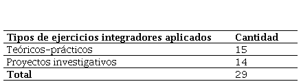 Para la elaboración y aplicación de ejercicios integradores, que se sugieren efectuar al menos una vez en el curso escolar, se puede emplear como variante la presentación y discusión de los resultados de trabajos investigativos (referativos, extracurriculares, de curso y de diploma), según el objetivo del año académico (Márquez, Santamaría y Suarez, 2022).