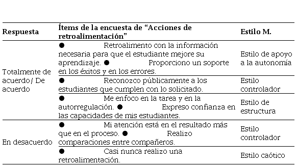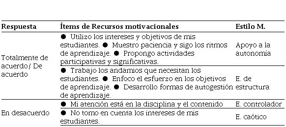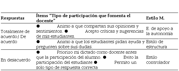 En el cuestionario, las docentes marcaron que estaban de acuerdo con ítems del estilo de apoyo a la autonomía, de estructura y con el controlador (ver tabla 2).