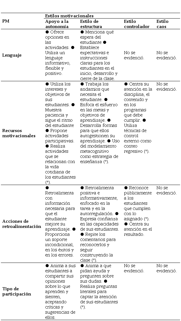 A pesar de esto, el estilo que evidenció más prácticas motivacionales en las observaciones de clase fue el estilo de estructura. Esto podría explicarse porque la investigación fue realizada en un entorno educativo remoto, lo cual podría estar influyendo en la comunicación, los recursos, la interacción docente-estudiante y la retroalimentación, generando que las maestras perciban la necesidad de mantener una mayor organización y un orden más claro de las actividades de las sesiones.