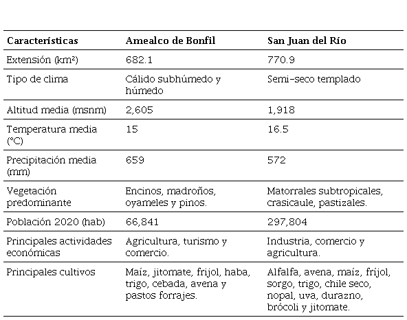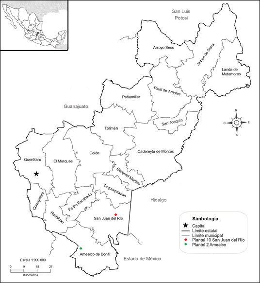 La experiencia educativa comenzó en un plantel educativo de Amealco de Bonfil bajo el modelo educativo tradicional y, posteriormente, se trasladó a una institución educativa con el enfoque de la NEM en San Juan del Río, ambos municipios ubicados al sur y sureste del estado de Querétaro (Figura 1). Algunas características biofísicas, poblacionales y económicas básicas de dichas entidades administrativas pueden apreciarse en la Tabla 1. Dichos planteles pertenecen al Colegio de Bachilleres del Estado de Querétaro (COBAQ), el cual opera con un modelo educativo basado en el enfoque constructivista que promueve el aprendizaje significativo y fomenta los valores en tres modalidades: escolarizada, educación a distancia y preparatoria abierta. Actualmente, el plantel 2 Amealco cuenta con una matrícula de 471 estudiantes y una plantilla de 28 docentes. Por su parte, el plantel 10 de San Juan del Río tiene una matrícula de 1895 estudiantes y 85 docentes.