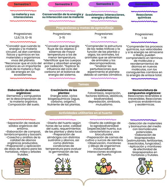 A diferencia de la educación básica, la Nueva Escuela Mexicana en media superior sugiere no centrarse en asignaturas específicas. En lugar de ello, se implementan proyectos que abordan temas multidisciplinarios y relevantes para la realidad de los estudiantes; no obstante, todavía se sigue trabajando por asignaturas. En este caso, el huerto escolar se comenzó a trabajar desde el Taller Ecológico, un módulo transversal que sirve como base para operacionalizar el manejo del huerto y vincularlo con otras asignaturas. Posteriormente, se visualizaron aquellas actividades utilitarias que generalmente se hacen para el manejo del huerto escolar, desde el compostaje hasta la evaluación del rendimiento agrícola. Luego, se revisaron los temas de las principales asignaturas del área de Ciencias Naturales, Experimentales y Tecnología, puntualizando en aquella s que tuviesen afinidad con las labores del huerto, esto con la intención de pasar de la teoría a la práctica y mantener el espacio productivo. Finalmente, se añadieron las progresiones y metas de aprendizaje, con tal de tener los elementos suficientes para las planeaciones didácticas de las clases (Figuras 2 y 3).