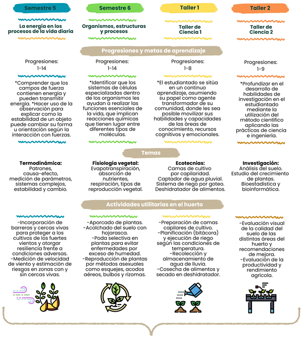 Lo ejemplificado en las figuras 2 y 3 es apenas una aproximación a la articulación del huerto con las materias de ciencias de la NEM, por lo que en ningún momento este acercamiento pretende ser una receta o podría tomarse como completado o plenamente articulado. En términos generales, lo que se busca es mostrar una vía coherente para caminar hacia ello e inspirar nuevas formas de articulación pedagógica en el marco de la NEM. Dado que un fenómeno latente entre la comunidad docente es el desconcierto con los lineamientos del nuevo modelo educativo, pues se han recibido pocas orientaciones prácticas para su operacionalización.