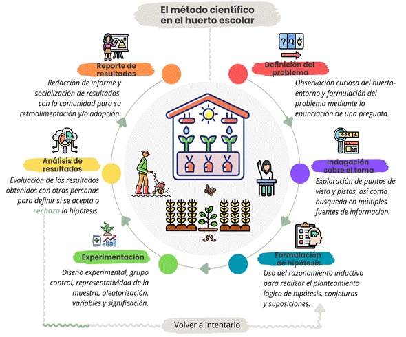 Como se trataba del área de ciencias, se comenzó a integrar el método científico en la dinámica del huerto escolar (Figura 4). Especialmente, porque esta es la vía primordial para la generación y comprobación de nuevos conocimientos en disciplinas como agronomía, biología, ecología, física y química. Esto resultó esencial para que los estudiantes comenzaran a formular interrogantes sobre los fenómenos ecológicos, fisiológicos y patológicos asociados a los cultivos del huerto escolar y de las parcelas de la comunidad. Por ejemplo, ¿cómo podemos saber si el suelo tiene los nutrientes suficientes para nuestros cultivos? ¿por qué algunas plantas crecen más que otras?, ¿qué relación hay entre los monocultivos y la incidencia de plagas-enfermedades?, ¿cómo podemos reducir el uso de agroquímicos en los cultivos de nuestra comunidad?
