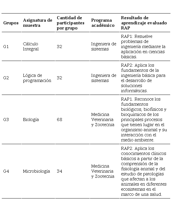 La muestra estuvo compuesta por 166 estudiantes, distribuidos de la siguiente manera: 64 pertenecientes al programa de Ingeniería de Sistemas y 102 al de Medicina Veterinaria y Zootecnia. La selección fue intencional, dado que los participantes cursaban los primeros dos semestres, donde se imparten las asignaturas vinculadas a los resultados de aprendizaje 1 (RAP1) y 2 (RAP2). La mayoría de los estudiantes tenía entre 16 y 19 años. La recolección de evidencias se extendió durante 16 semanas.