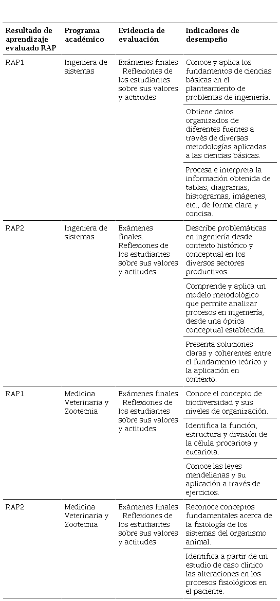 La Tabla 2 presenta el mapeo detallado de los RAP1 y RAP2 para cada programa académico evaluado, incluyendo sus respectivos indicadores de desempeño y evidencias de evaluación seleccionadas.