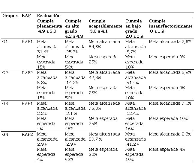 Los resultados detallados del Plan de Assessment para cada grupo y RAP se presentan en la Tabla 3. Un análisis comparativo entre los grupos revela patrones distintivos en el logro de los objetivos de aprendizaje y en el cumplimiento de las metas institucionales.