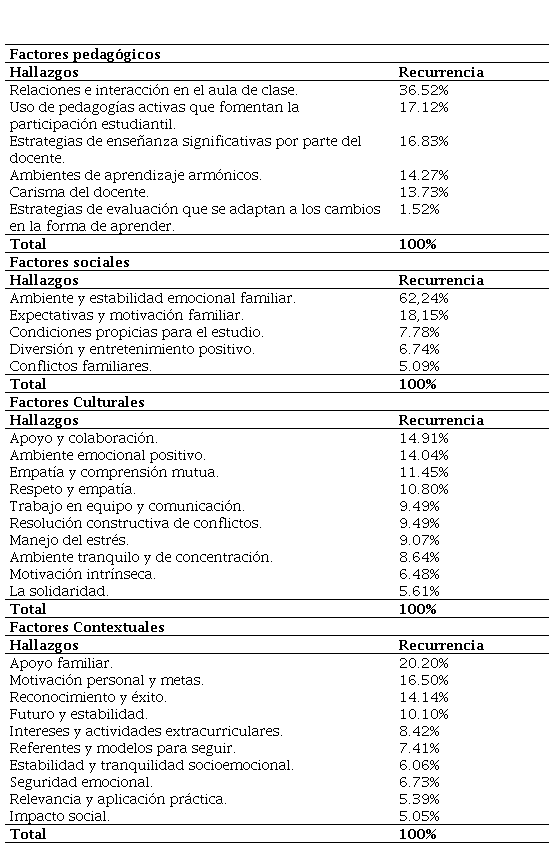 Finalmente, en relación con los factores culturales y contextuales, se resalta la importancia de una red de apoyo en el entorno sociocultural del estudiante, para que se sienta reconocido, acompañado y protegido en su comunidad, y le permita un contexto sano en el que se tejan acuerdos culturales positivos. Se destaca también una comunicación efectiva en ese contexto sociocultural, en el que se generen dinámicas de una comunicación fundamentada en el respeto, la empatía, la sinergia colectiva, la solidaridad, la resiliencia, la justicia, la equidad y el trabajo colaborativo para el logro de metas comunes. Todos estos aspectos son determinantes para una motivación y sentido de un aprendizaje con propósito de crecimiento personal y desarrollo social.