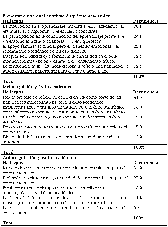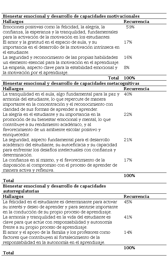 A continuación, se analizan y describen los principales hallazgos en el marco de cada una de las categorías de investigación: factores que influyen en el bienestar emocional en el aprendizaje; acciones pedagógicas que se fundamentan en las emociones positivas, y que favorecen la motivación, metacognición y autorregulación del aprendizaje; bienestar emocional y desarrollo de capacidades motivacionales, metacognitivas y autorregulatorias; e impacto del bienestar emocional, la motivación, metacognición y autorregulación, en el éxito académico.
