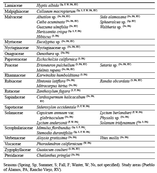 The genus Mimosa, which includes Mimosa distachya var. laxiflora (catclaw), is a plant of the Leguminosae (Fabaceae) Mimosoideae subfamily and is native to Northern and Southern America (Robinson, 1898). In Mexico it is mainly distributed in the region of northern Mexico corresponding to the states of Baja California, Chihuahua, Sinaloa and Sonora and in southern Mexico in Colima, Jalisco, Michoacán, Nayarit and Yucatán (Molina-Freaner et al., 2010; Instituto de Biología, 2010). Many species of mimosas are economically and socially important, as they are used for reforestation, timber production and medicinal purposes, as well as their ability to fix nitrogen. Flowers of several Mimosa species are also a major source of nectar for honey production (Simon et al., 2011). The genus Prosopis, which includes Prosopis velutina (mesquite), is also found within the family Fabaceae, subfamily Mimosoideae, and is native to the Asian, African and American continents. The genus includes 44 species distributed in arid and semiarid regions (Burkart, 1976; Palacios, 2006). In Mexico it has a wide distribution and is found along the Pacific coast, from the states of Michoacán to Oaxaca, in the Gulf of Mexico in Nuevo León, Tamaulipas and northern Veracruz and throughout the central region of the country (Gallegos-Infante et al., 2013). Mesquite is an important plant species due to its high potential for nitrogen fixation in very dry areas and during drought seasons, and it provides shelter and food to humans and many species of animals that feed on its leaves, fruits nectar and pollen (Almaraz-Abarca et al., 2007).