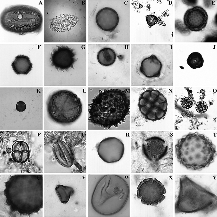 Different scales are indicated for each pollen type. Acanthaceae: Dicliptera (A, 1000x). Agavaceae: Agave angustifolia (B, 400x). Chenopodiaceae-Amaranthaceae: Chenopodium sp. (C, 1000x), Malvaceae: Ceiba acuminata (D, 200x). Asteraceae: Ambrosia (E, 1000x), Asteraceae (F, 1000x), Asteraceae (G, 1000x). Burseraceae: Bursera laxiflora (H, 1000x), Bursera microphylla (I, 1000x). Cactaceae: Cylindropuntia thurberi (J, 200x), Stenocereus alamosensis (K, 200x). Fabaceae: Caesalpinia pulcherrima (L, 1000x). Convolvulaceae: Ipomoea arborescens (M, 400x). Fabaceae: Acacia sp. (N, 1000x), Havardia type (O, 400x), Mimosa distachya var. laxiflora (P, 1000x), Olneya tesota (Q, 1000x), Prosopis velutina (R, 1000x). Fagaceae: Quercus sp. (S, 1000x). Malvaceae: Abutilon (type, T, 1000x), Herissantia crispa (U, 1000x). Myrtaceae: Eucalyptus sp (V, 1000x). Poaceae sp. (W, 1000x). Rubiaceae: Mitracarpus hirtus (X, 1000x). Sapindaceae: Cardiospermum halicacabum (Y, 1000x).