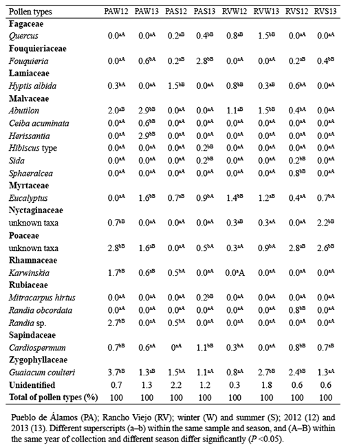 However, no detailed studies of pollen analysis exist for the region of Sonora. The aim of this study was to evaluate the pollen composition of Sonoran propolis obtained from the central Sonoran apicultural production area (Ures, Sonora) and to determine its relationship with the regional vegetation and the effect of seasonality on frequency and amount of pollen loads.