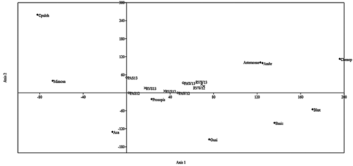 In order to evaluate the differences among propolis samples collected from different sites and seasons, a multivariate analysis (detrended correspondence analyses, DCA) was performed (Fig. 2). The ordination of samples and pollen source based on the two first axes (Axis 1 and Axis 2) of the DCA indicate that analyzed propolis were separated seasonally (summer samples left direction and winter samples clockwise), and slightly geographically. Most pollen types are clearly grouped by families and Prosopis pollen was significantly closer to propolis samples collected in both study sites (P <0.05). Also, propolis samples from PA are clearly more grouped at the top left than RV, mainly in summer. As a result, this was also observed for summer propolis samples from PA (Table 2), which showed high levels of Mimosa, while summer propolis from RV showed a high content of Prosopis pollen (P <0.05), which corresponds to differences in the local vegetation (Mimosa is more abundant in the thornscrub foothills of PA and Prosopis in the riparian vegetation of RV). Additionally, Mimosa has more intense flowering periods in summer and Prosopis in the spring, although both plants flower from spring to late summer.