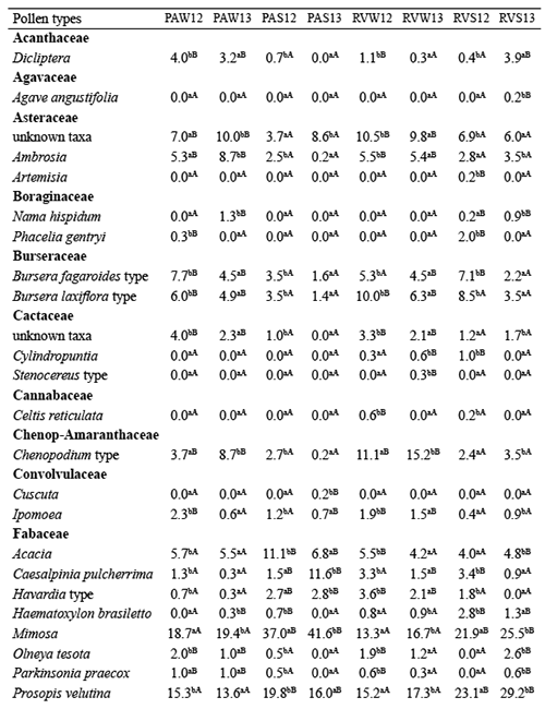 The vegetation of the sampling zones was dominated by subtropical species (Table 1), mainly from the Fabaceae (18.5%), Cactaceae (10.2%), Malvaceae (8.3%) and Asteraceae (6.5%) families. Pollen analysis showed a diversity of pollen types in the studied propolis samples. A total of 42 pollen types (Table 2) belonging to 22 families were identified; some of the principal pollen types are illustrated in Fig. 1. The families with the highest pollen frequencies (>15%, <45%) were Fabaceae, Asteraceae, Burseraceae, Chenopodiaceae-Amaranthaceae and Zygophyllaceae. The highest pollen concentrations were identified in the summer propolis samples, corresponding to Mimosa distachya var. laxiflora (PAS12, 37%; PAS13, 41.6%) in Pueblo de Álamos and Prosopis velutina (RVS12, 23.1%; RVS13, 29.2%) in Rancho Viejo. A reduction in the frequencies of these pollen types was found for propolis samples produced during the winter, both at Pueblo de Álamos (Mimosa distachya var. laxiflora; PAW12, 18.7%; PAW13, 19.4%) and Rancho Viejo (Prosopis velutina; RVW12, 13.3%; RVW13, 16.7%). According to these samples, six bifloral (15 to 45% pollen frequencies: PAW12, PAS12, PAS13, RVW13, RVS12 and RVS13) and two multifloral (<15% pollen frequencies: RVW12 and PAW13) propolis samples were recorded, distributed among both regions.