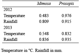 Statistical correlation analyses carried out in order to compare the relationship between the measured meteorological parameters (temperature and rainfall) and the most important pollen types (Mimosa distachya var. laxiflora and Prosopis velutina) showed significant association (P <0.05) between temperature, rainfall and pollen content (Table 3).