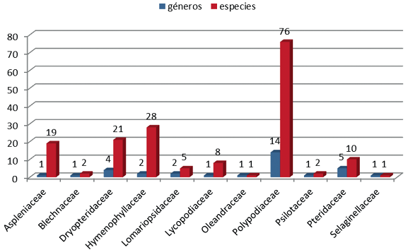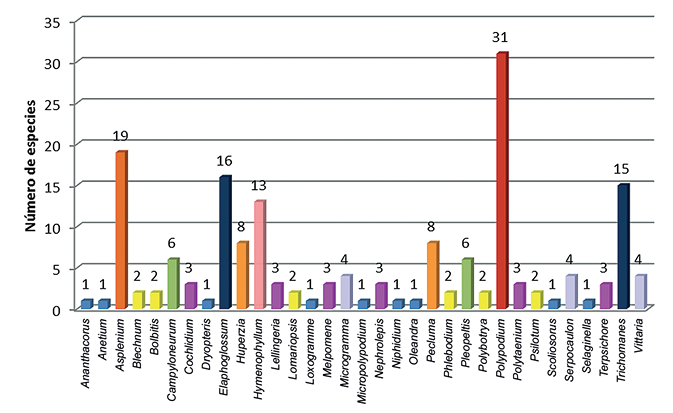 Las familias mejor representadas a nivel genérico son: Polypodiaceae con 14 (42.4%), Pteridaceae con 5 (15.1%), Dryopteridaceae con 4 (12.1%) e Hymenophyllaceae y Lomariopsidaceae con 2 cada una (6%) (Fig. 1). A nivel específico lo son: Polypodiaceae con 76 (43.9%), Hymenophyllaceae con 28 (16.1%), Dryopteridaceae con 21 (12.1%), Aspleniaceae con 19 (11%) y Pteridaceae con 10 (5.8%) (Fig. 1). Los géneros con mayor número de especies son: Polypodium con 31 (17.9%), Asplenium con 19 (11%), Elaphoglossum con 16 (9.2%), Trichomanes con 15 (8.7%) e Hymenophyllum con 13 (7.5%) (Fig. 2).