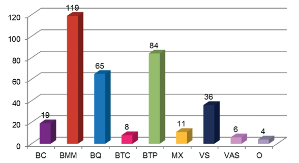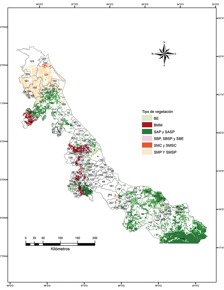 (BC = bosque de coníferas; BMM = bosque mesófilo de montaña; BQ = bosque de Quercus; BTC = bosque tropical caducifolio; BTP = bosque tropical perennifolio; MX = matorral xerófilo; VS = vegetación secundaria; VAS = vegetación acuática y subacuática; O = otros).