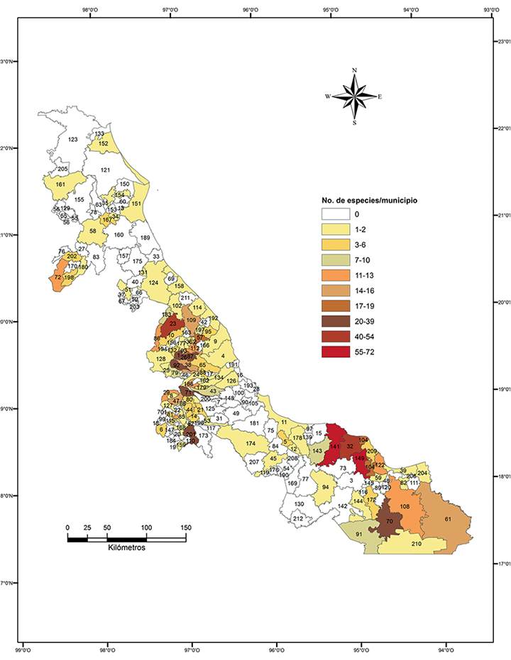 De los 212 municipios en que se divide el estado, en 113 (53.3%) hay al menos un registro del grupo en estudio y en 99 ninguno. Los que presentan el mayor número de especies son: San Andrés Tuxtla con 73, Soteapan con 62, Atzalan con 52, Catemaco con 50, Acajete con 39, Huatusco con 36, Hidalgotitlán con 33, Zongolica con 33, Tlalnelhuayocan con 31, Xalapa con 28 y Xico con 24 (Fig. 5).