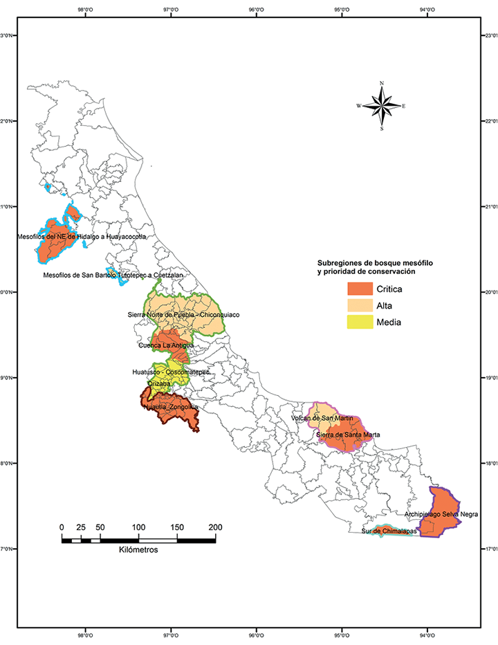 En lo concerniente a la distribución de epífitas por tipo de vegetación (sensu Rzedowski, 2006), encontramos que de manera similar a lo que ocurre en entidades como Hidalgo y Chiapas (Wolf y Flamenco-Sandoval, 2003; Ceja-Romero et al., 2010), y a pesar de que en Veracruz el bosque mesófilo de montaña ha sido transformado en un 90% de su superficie original para otros usos (Williams-Linera, 2002), es la comunidad que cuenta con el mayor número de taxa con esta forma de vida, representando 18.8% de las 630 especies de helechos reportadas en el país para este tipo de vegetación por Tejero-Díez et al. (2014). Lo anterior corrobora una vez más que no obstante ocupar una extensión reducida, es la asociación vegetal en la que se encuentran más diversificadas las plantas epífitas (Rzedowski, 1996, 2006). En este sentido es importante tomar en cuenta que seis de las 15 subregiones de bosque mesófilo de montaña, consideradas por la CONABIO (2010) como de prioridad crítica, están o incluyen alguna porción del estado (Fig. 6). Además algunos de los municipios que se localizan dentro de ellas como Huayacocotla, Llamatlán, Tlaltetela, Texcatepec, Zontecomatlán, entre otros, registran en este trabajo un número de especies bajo o nulo (Fig. 5), situación que podría cambiar una vez que se cuente con un mejor conocimiento florístico de ellos.