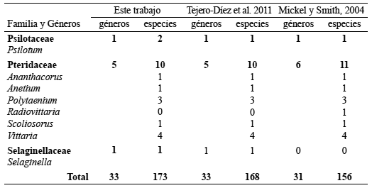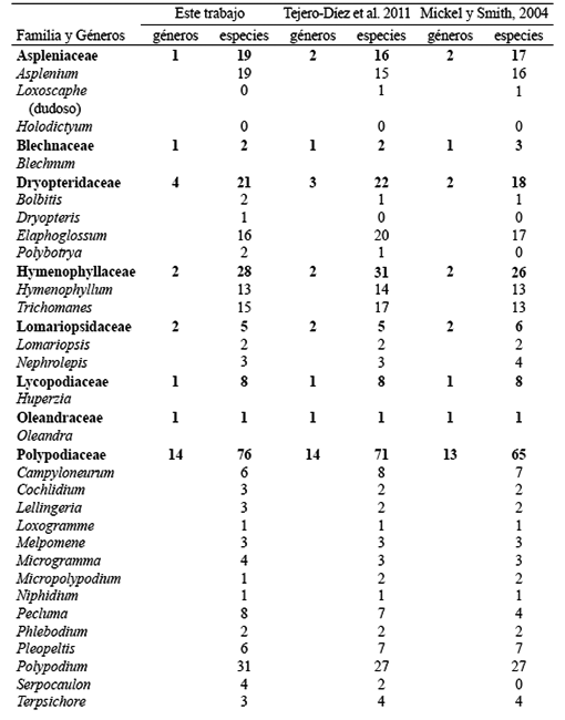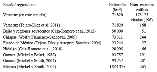 La comparación de nuestros resultados con los obtenidos en trabajos que cuentan con información a nivel estatal o regional sobre el tema (Cuadro 1) pone de manifiesto la importancia del estado de Veracruz en lo que se refiere a riqueza de especies de pteridofitas y licofitas epífitas, al contar en su territorio con entre 173 y 196 taxa (esta última cifra si se consideran los citados en la literatura), quedando solo por debajo de Chiapas y Oaxaca, que cuentan con 244 y 201 especies con esta forma de vida respectivamente (Wolf y Flamenco-Sandoval, 2003; Mickel y Smith, 2004). También resulta evidente que a medida que se tiene un mejor conocimiento florístico de las diferentes regiones de la entidad, se incrementa de manera gradual el número de taxa epífitos reportados en el estado (Cuadro 2).