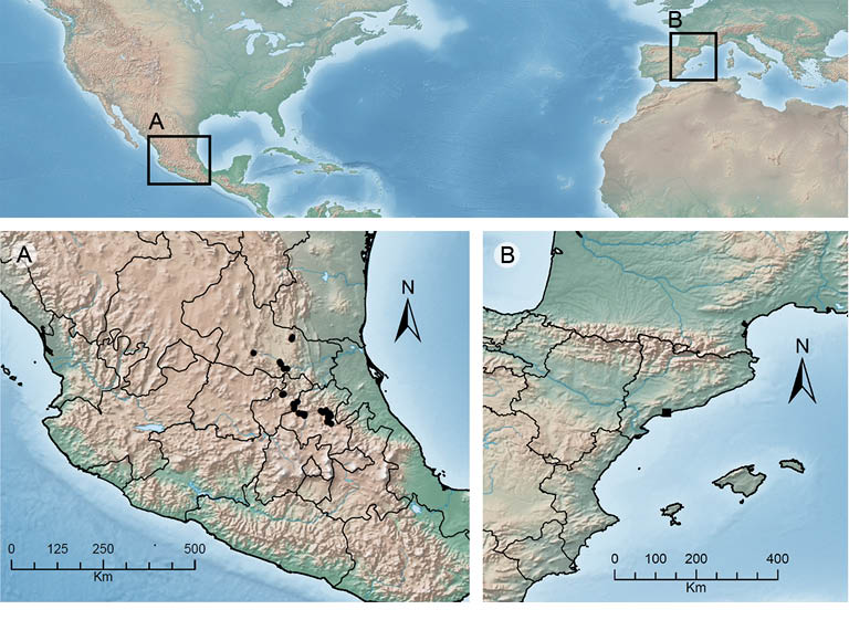 Uno de los taxones menos conocidos y con una distribución más limitada (Fig. 1) dentro del género es Agave difformis A. Berger. Del grupo Marginatae, se trata de un taxón morfológicamente cercano a A. funkiana y A. lechuguilla que, junto a los cuales, forma un complejo taxonómico aún no resuelto (A. García-Mendoza, com. pers.). Agave difformis es localmente abundante en la Barranca de Metztitlán y en las áreas colindantes en el estado de Hidalgo (México), pero fuera de este área es raro (Eguiarte et al., 2013). Gentry (1982) indicó que habita en suelos gruesos calcáreo-rocosos en la cara desértica de la Sierra Madre Oriental en los estados de San Luis Potosí e Hidalgo, en elevaciones entre 1560 y 1875 m. Arzate (2009), en Metztitlán, la cita en suelos derivados de roca basáltica. Si se consideran solamente las poblaciones de Hidalgo, parece tratarse de un agave muy local, puesto que se encuentra en un área de solamente 400 km2 (Eguiarte et al., 2013). Sin embargo, puede llegar a ser muy abundante en los lugares donde se ha observado; por ejemplo, Eguiarte et al. (2013) estimaron una población de más de tres millones de rosetas sólo para la Barranca de Metztitlán. En los últimos años han aparecido varias referencias que amplían su área conocida de distribución al estado de Querétaro (Arias y Sánchez-Martínez, 2010; Zepeda-Martínez et al., 2013; y espécimen depositado en el Herbario Nacional de México (AGA804233), recolectado en el municipio de Peñamiller; http://unibio.unam.mx/collections/specimens/urn/IBUNAM:MEXU:AGA804233).