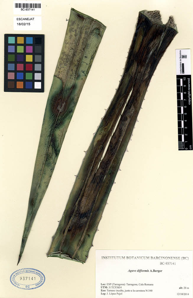 En el curso de una prospección de flora naturalizada en la provincia de Tarragona (noreste de la península ibérica) se descubrió una pequeña población de Agave difformis. La identificación se realizó mediante literatura especializada (Gentry, 1982; Thiede, 2001) y consulta de los herbarios ARIZ, ASU, DES, K, MEXU, MO, SLPM y US. Se ha depositado un pliego testigo en el herbario del Instituto Botánico de Barcelona (BC) (Fig. 2). También se ha trasplantado uno de los ejemplares que conforman la población al Jardín Botánico de Barcelona para su conservación ex situ. En octubre de 2014 se realizó un primer censo de los ejemplares, que se repitió en agosto de 2015 (diferenciando estadios de desarrollo). Aunque en la visita inicial (2014) se tomaron algunas medidas, en la segunda (2015) se hicieron numerosas de tipo morfométrico de una manera sistematizada que incluyeron: (1) altura de la roseta, (2) anchura de la roseta (diámetro mayor), (3) número de hojas de la roseta, (4) longitud de la hoja, (5) anchura de la hoja (en su punto más ancho, que se encuentra entre el tercio proximal y la mitad de la hoja), (6) longitud de los dientes marginales, (7) separación entre dientes, y (8) longitud de la espina terminal. Para tal propósito se escogieron solamente las rosetas que consideramos como “adultas” (las que tenían como mínimo 0.7 m de altura). Mientras que las tres primeras medidas (altura y anchura de la roseta más el número de hojas) se hicieron de todas las rosetas adultas, las de la longitud de la hoja, la anchura de la hoja y la longitud de la espina terminal se tomaron de cinco hojas (que nunca fueron basales ni terminales) seleccionadas al azar de diez rosetas adultas también escogidas aleatoriamente. De entre estas cinco hojas se eligió una al azar de la que se midió la longitud de todos los dientes marginales (excepto los situados en el décimo proximal y el tercio distal, que se descartaron) y la distancia entre éstos. Finalmente, se anotaron las especies acompañantes y se tomaron numerosas fotografías (mediante una cámara digital Finepix HS30; Fujifilm, Tokio, Japón).